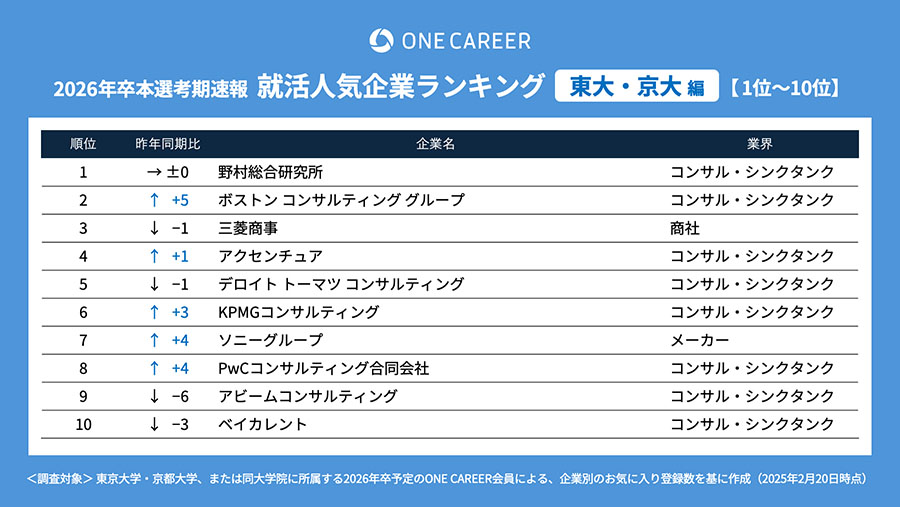 実際、ONE CAREERが実施した「就活人気企業ランキング【東大・京大編】(26卒本選考期速報)順位一覧」を見ても、人気上位10社中8社がコンサルとなっている。